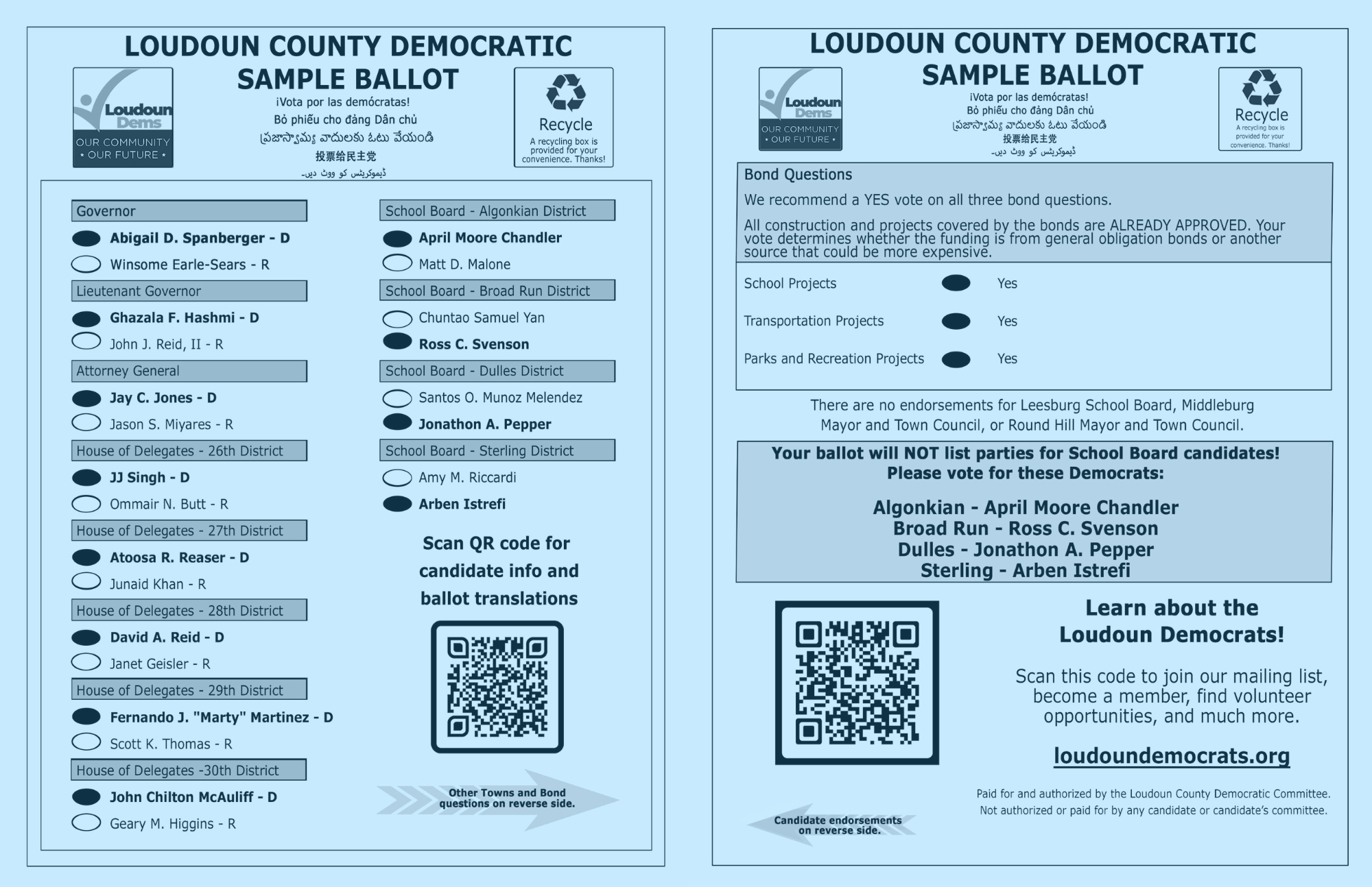 To make voting simple, the Loudoun County Democratic Committee has prepared a Democratic sample ballot with our endorsed candidates. These ballots list the full Democratic ticket – from top to bottom – so you know exactly who is standing up for our values on education, health care, housing, workers’ rights, and more.